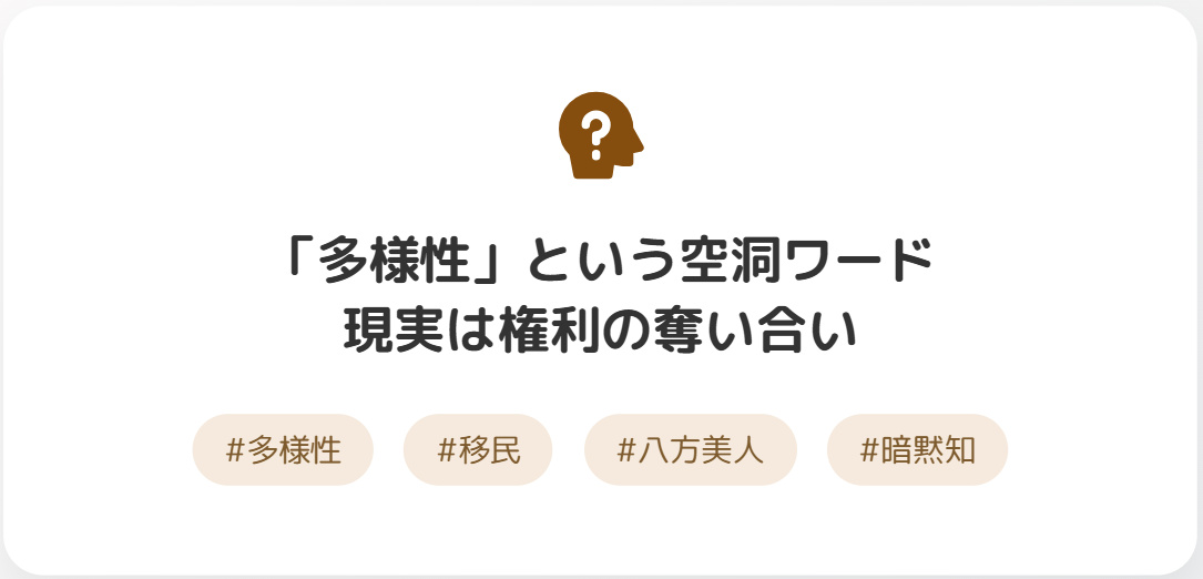 今回は、そんな「多様性」という言葉が、特に政治や社会の文脈でどう使われがちか、そしてそれがぼくらの現実とどう関わってくるのか、ぼくなりの考えをちょっと整理してみたいと思います。