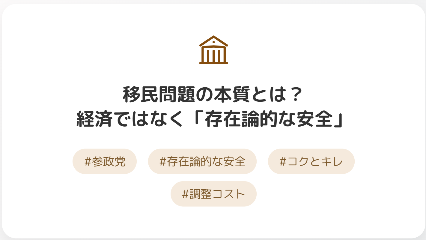 だから、移民問題の根本は、経済問題である前に、この「存在論的な安全が脅かされる」という、極めて感情的で、根源的な問題なのだと、ぼくは思います。