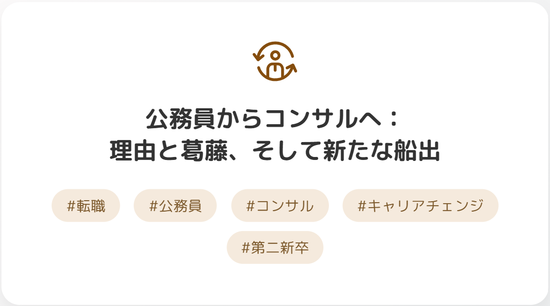 今回は、その葛藤に触れながら、ぼくが公務員を選んだ(ちょっと変わった)理由から、現職(ベンチャーコンサル)への転職を決意した経緯、そして仕事内容について深掘りしていきたいと思います。