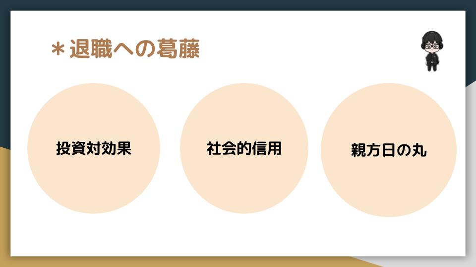 いや、そりゃ、葛藤しない方がおかしいです。退職すれば、この絶対的な守護神を自ら捨てることになるからです。