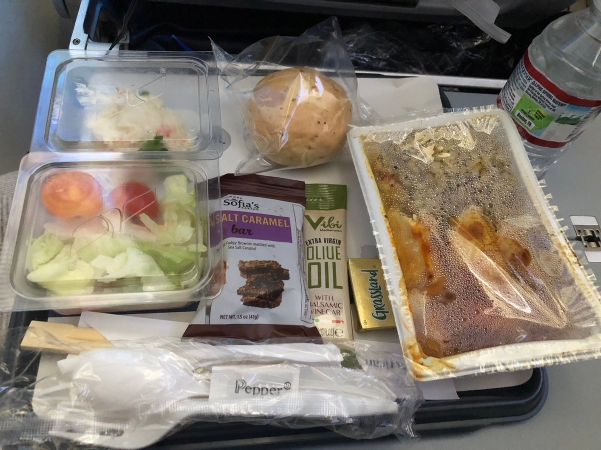 あ、機内食はこんな感じでした。刑務所の食事よりは若干豪華…なイメージですかね?(いや、刑務所の飯は知りませんけども。)